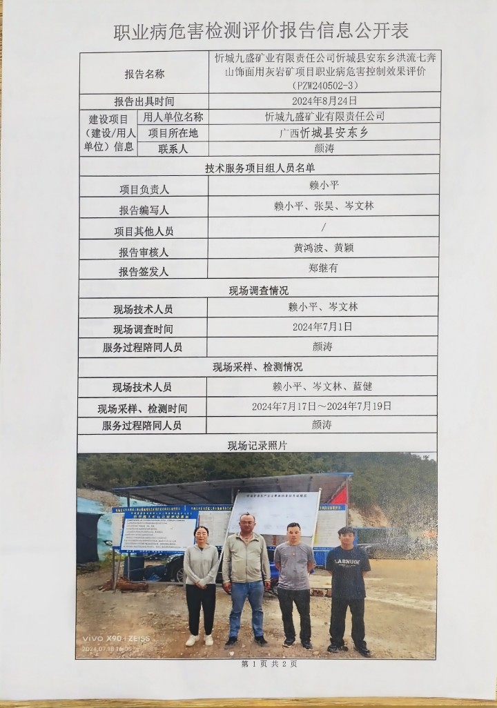 忻城九盛矿业有限责任公司忻城县安东乡洪流七奔山饰面用灰岩矿项目职业病危害控制效果评价(PZW240502-3)