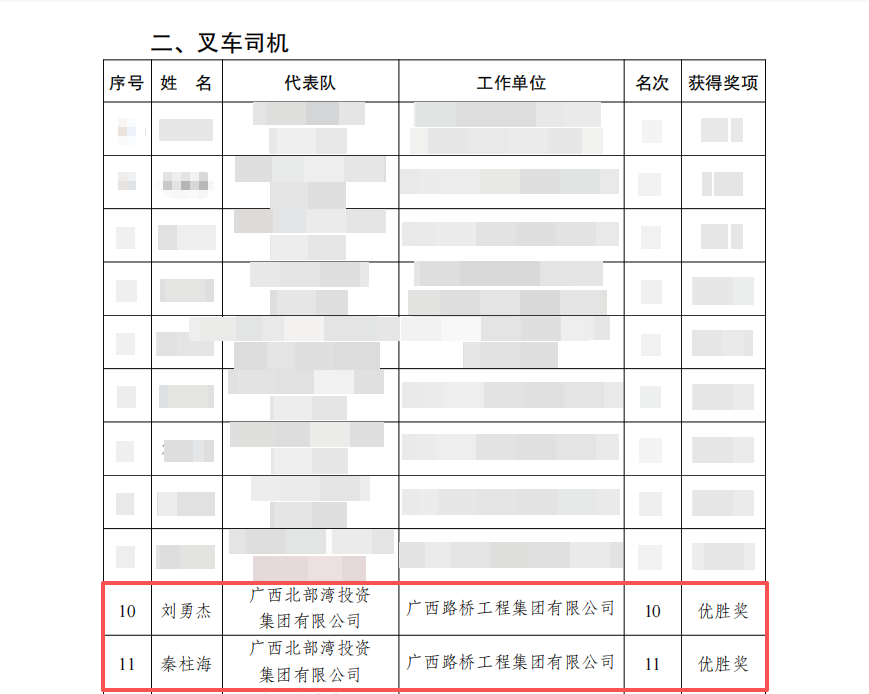 近日,从《自治区国资委 自治区人力资源社会保障厅 自治区总工会关于2025年广西国有企业职工职业技能竞赛获奖结果的通报》中获悉,广西工程技术研究院有限公司员工秦柱海、刘勇杰,代表广西北部湾投资集团有限公司参加叉车司机项目竞赛,凭借扎实的专业技能与稳定的现场发挥,双双斩获优胜奖,排名分别为第11名与第10名。
