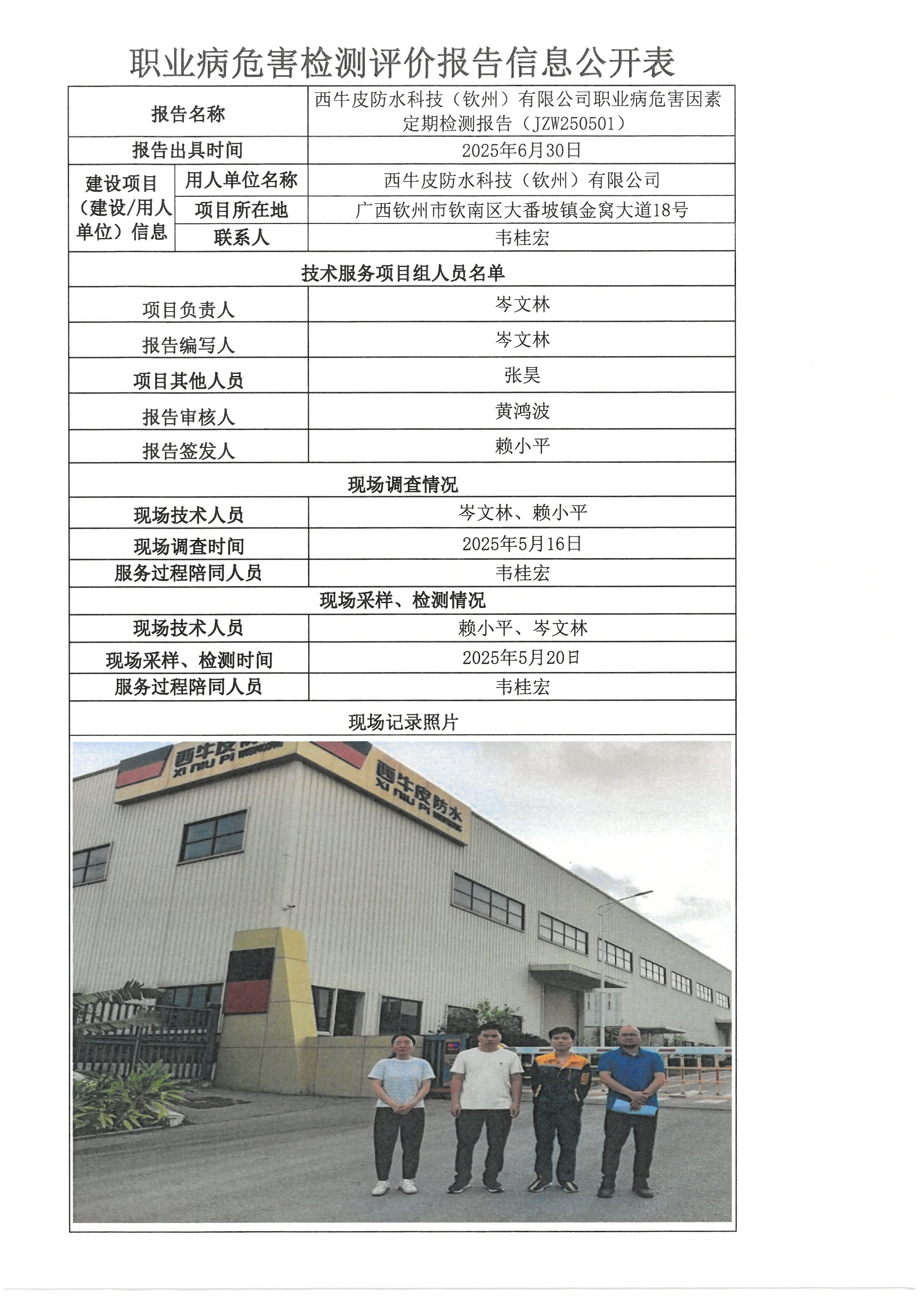 西牛皮防水科技(钦州)有限公司职业病危害因素定期检测报告(JZW250501)