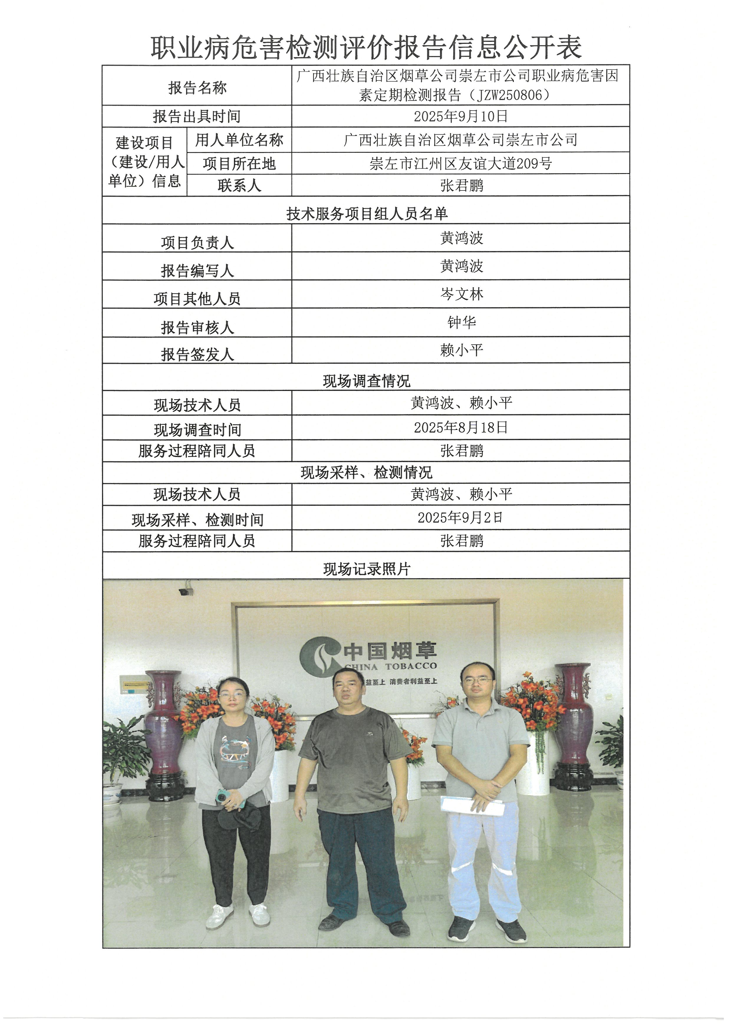广西壮族自治区烟草公司崇左市公司职业病危害因素定期检测报告(JZW250806)