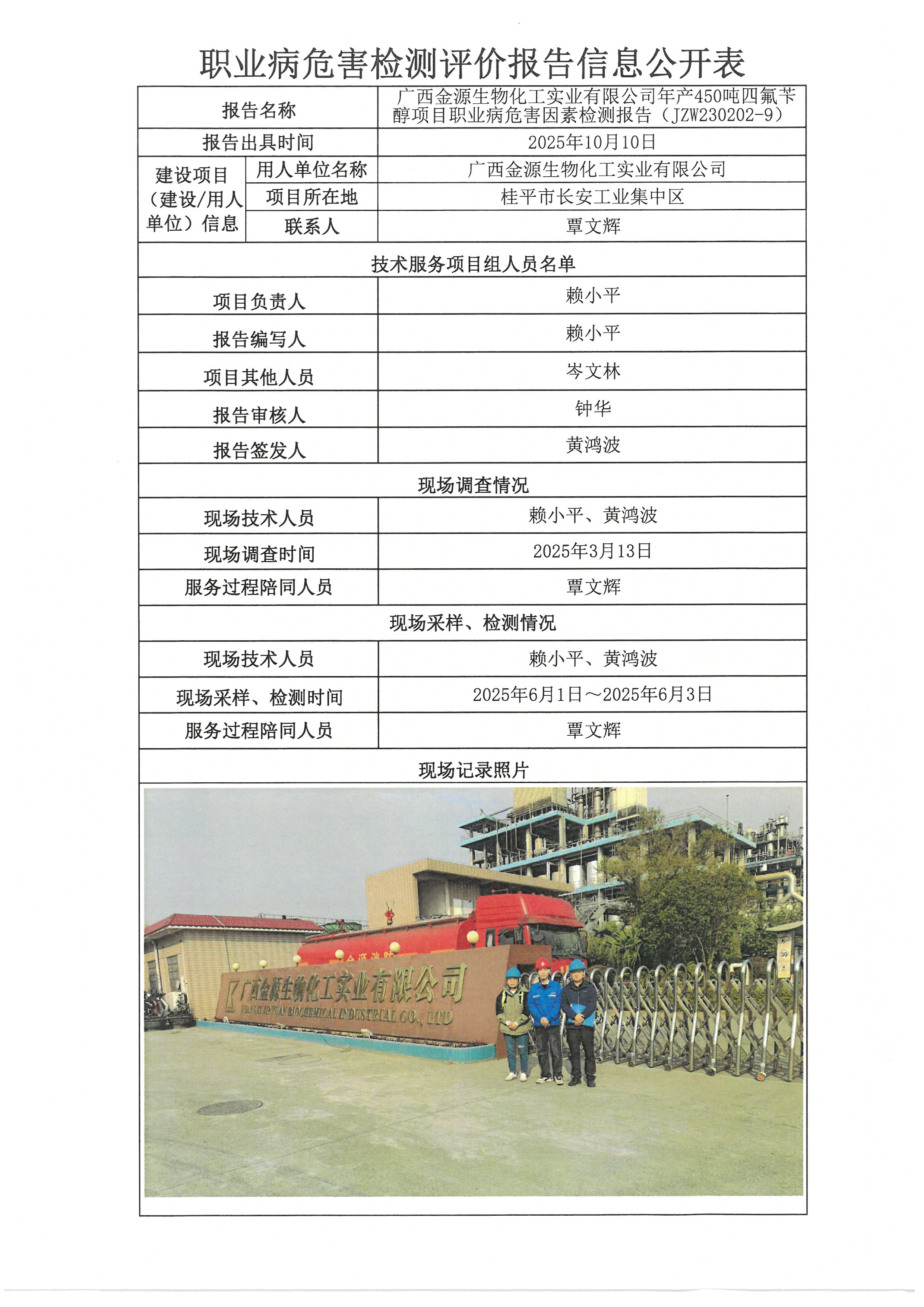 广西金源生物化工实业有限公司年产450吨四氟苄醇项目职业病危害控制效果评价(PZW230202-9)