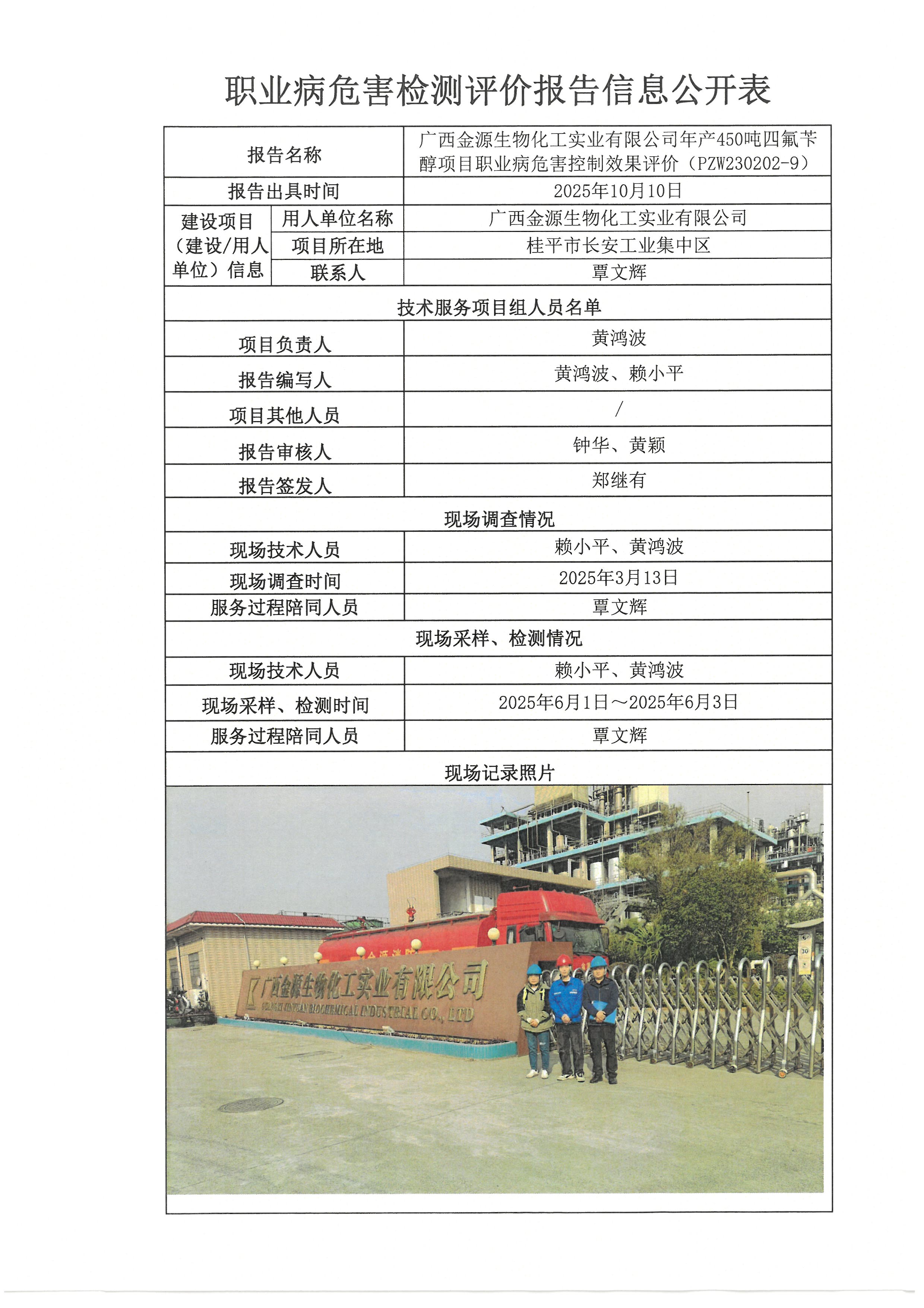广西金源生物化工实业有限公司年产450吨四氟苄醇项目职业病危害控制效果评价(PZW230202-9)