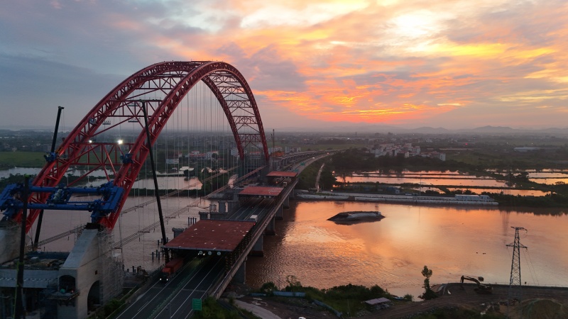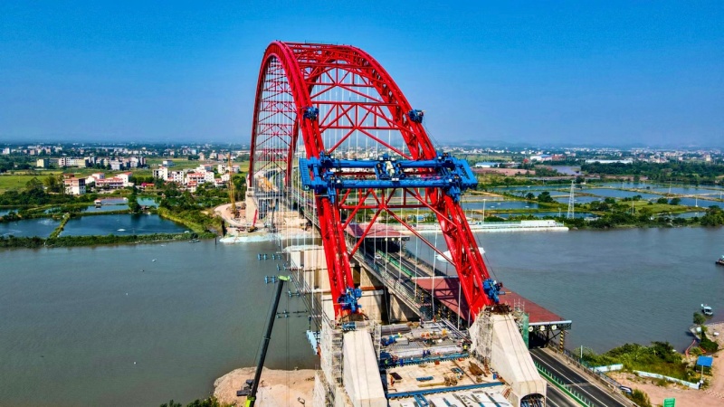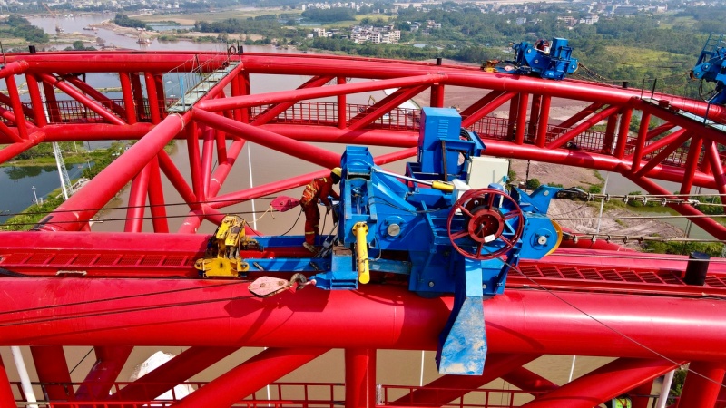 平陆运河G75兰海高速钦江大桥采取半幅拆建半幅保通的建设方式,施工场地受限。爬拱吊机利用拱肋作为轨道,起重能力达120吨,最大爬坡角度43度,实现带格子梁构件全桥“背负式”爬行安装。爬拱吊机“智造”技术由广西路桥集团自主研发,并首次应用在钢管混凝土拱桥安装格子梁中。